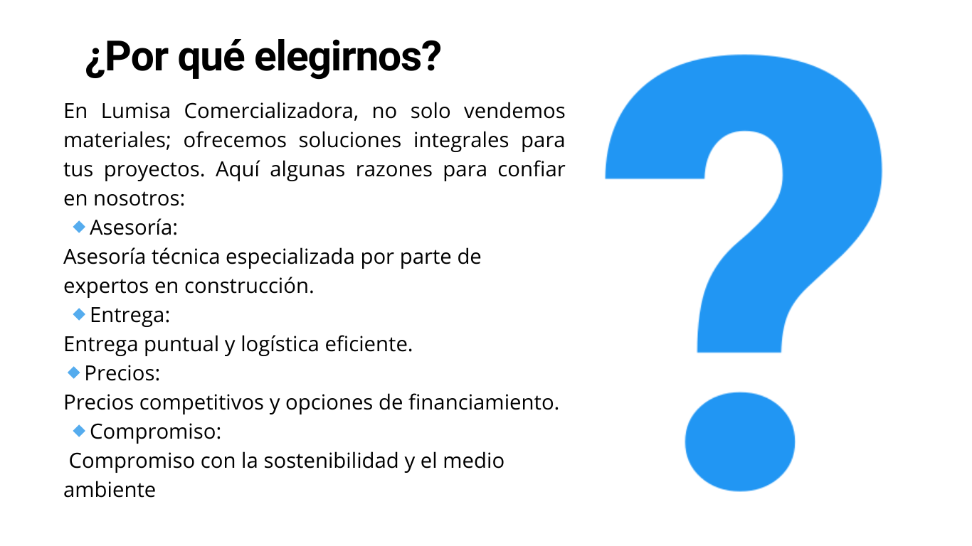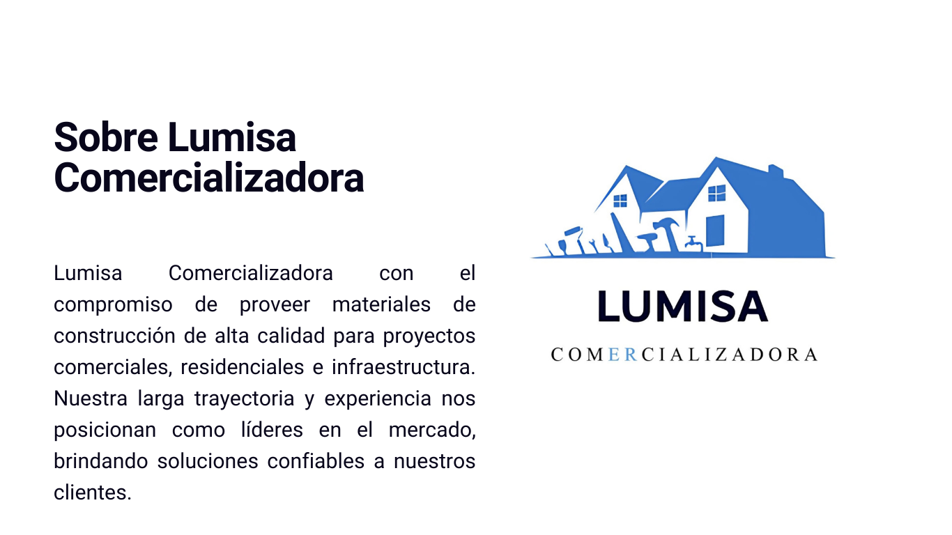 En Lumisa Comercializadora, nos enorgullece ofrecer materiales de construcción de la más alta calidad, ideales para todo tipo de proyectos. Nuestros productos están diseñados para garantizar durabilidad, eficiencia y satisfacción en cada obra.